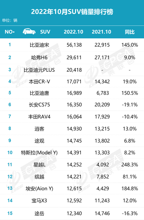 今年,比亚迪宋彻底成为SUV细分市场的领头羊。10月,比亚迪宋销量为56138辆,同比增长145%,环比9月的45934辆增长22.2%,排名第1。