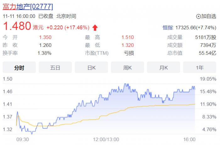 行业曙光频现,投资者信心大增。11月11日收盘,富力大涨17.46%。