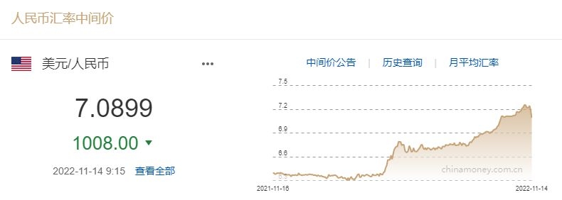 11月14日,人民币兑美元中间价调升1008点至7.0899,创2022年9月27日以来最高,调升幅度创2005年7月22日以来最大。前一交易日中间价报7.1907,在岸人民币16:30收盘价报7.1106,23:30夜盘收报7.0935。