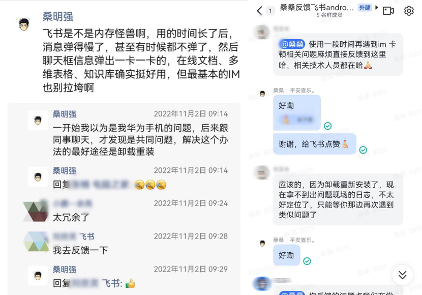 很快,有飞书员工在他朋友圈下面留言会去反馈下。效果也确实不错:对方在1小时内就拉了个飞书群,然后负责人把问题转到技术那边,IM的相关技术人员都在群里,回应也很迅速。不过因为软件被重装了一遍,所以还得等再出状况才能进行具体的问题定位。