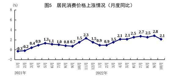 1-10月份,全国居民消费价格(CPI)同比上涨2.0%。10月份,全国居民消费价格同比上涨2.1%,涨幅比上月回落0.7个百分点;环比上涨0.1%。分类别看,食品烟酒价格同比上涨5.2%,衣着价格上涨0.5%,居住价格下降0.2%,生活用品及服务价格上涨1.4%,交通通信价格上涨3.1%,教育文化娱乐价格上涨1.2%,医疗保健价格上涨0.5%,其他用品及服务价格上涨1.9%。在食品烟酒价格中,鲜菜价格下降8.1%,粮食价格上涨3.6%,鲜果价格上涨12.6%,猪肉价格上涨51.8%。扣除食品和能源价格后的核心CPI同比上涨0.6%,涨幅与上月持平。