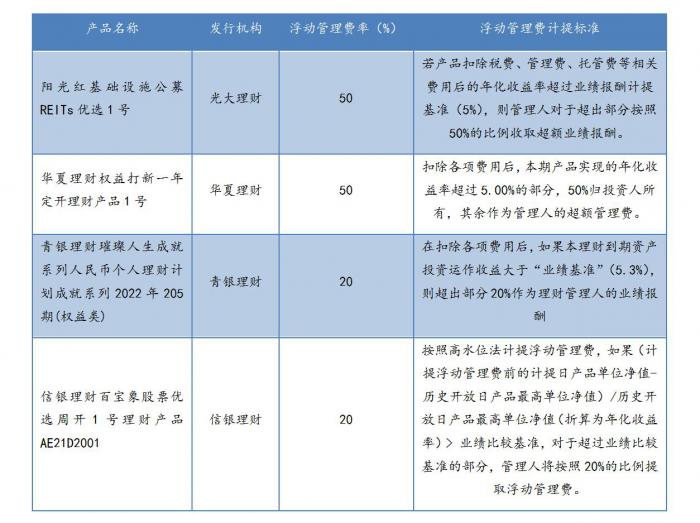 值得注意的是,权益类理财产品除基础的固定管理费、托管费和销售服务费外,部分产品会取得超额收益时对超过设定业绩比较计准的部分按一定比例收取浮动管理费,该费率的收取比例由各家机构自行设定,存在一定差异。根据普益标准统计,目前市场上存续的权益类理财产品中,光大理财、华夏理财、青银理财、信银理财的四款产品设定了浮动管理费。从费率水平来看,光大理财和华夏理财将费率设置为50%,而青银理财和信银理财费率标准为20%。同时,各家机构在浮动管理费的计提标准上也各有不同:光大理财、华夏理财、青银理财均选择了以业绩比较基准或固定的业绩报酬计提基准作为浮动管理费的计提标准,而信银理财则采用“高水位法”计提超额业绩,即每个开放日计算到期收益率时将采用历史开放日的最高累计净值作为初始日的净值,根据该净值计算的到期收益率若超过业绩基准时机构才计提超额业绩报酬。这也就意味着,一旦某个开放日产品表现较为突出,则其后的每一个开放日都将使用该日的净值作为计算到期收益率的初始净值。这种计提方法对产品的运作提出了更高要求,只有当该款产品其后表现更加突出时,机构才有可能收取超额业绩报酬。