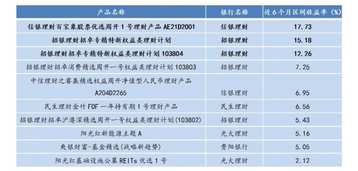 图表4.权益类银行理财产品近6个月区间收益率排名前10位