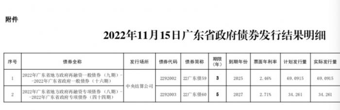 中国债券信息网显示,广东省11月15日成功发行再融资债券103亿元,其中3年期一般债、5年期专项债发行规模分别为69亿元、34亿元,票面利率分别为2.46%、2.71%,高出国债基准10BP、18BP。