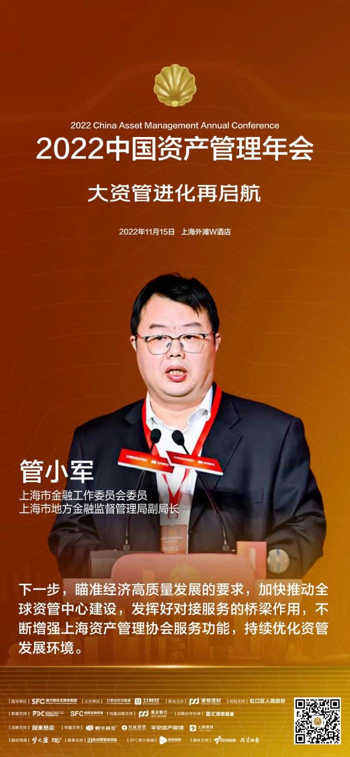 会上,上海市金融工作委员会委员、上海市地方金融监督管理局副局长管小军发表致辞。他表示,上海高度重视资产管理行业发展,下一步将瞄准经济高质量发展的要求,加快推动全球资管中心建设。