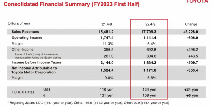 其中,2022财年第二季度(2022年7月1日-2022年9月30日),丰田汽车总营收为9.2万亿日元,同比增长22%,超过预期的8.8万亿日元;营业利润同比下降25%至5627.98亿日元,低于市场预期的7650亿日元;归属于公司净利润4342.6亿日元,同比下降31%,市场预计的这一数字为7192亿日元。