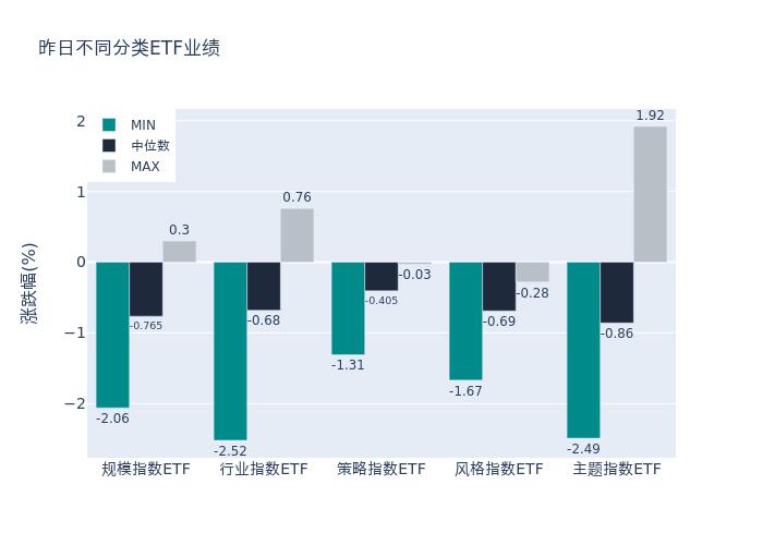 昨日股票型ETF收益率中位数为-0.765%。其中按照不同分类,规模指数中富国国证疫苗与生物科技ETF收益率最高,为0.3%;行业指数中电力ETF收益率最高,为0.76%;策略指数中南方富时中国国企开放共赢ETF收益率最高,为-0.03%;风格指数中华夏中证智选500价值稳健策略ETF收益率最高,为-0.28%;主题指数中国泰中证沪港深动漫游戏ETF收益率最高,为1.92%。