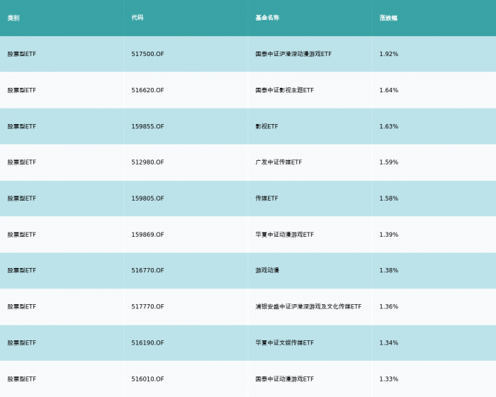昨日股票型ETF涨幅最高的3支ETF及其收益率分别为:国泰中证沪港深动漫游戏ETF(1.92%)、国泰中证影视主题ETF(1.64%)、影视ETF(1.63%)。涨幅前10详情见下表: