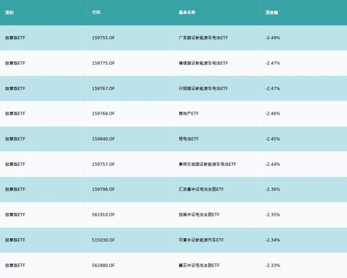 昨日股票型ETF跌幅最大的3支ETF及其收益率分别为:广发国证新能源车电池ETF(-2.49%)、建信国证新能源车电池ETF(-2.47%)、兴银国证新能源车电池ETF(-2.47%)。跌幅前10详情见下表: