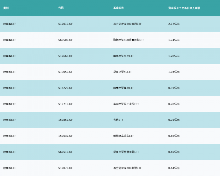 昨日股票型ETF资金流入最多的3支ETF及其流入金额分别为:易方达沪深300医药ETF(流入2.17亿元)、鹏扬中证500质量成长ETF(流入1.74亿元)、国泰中证军工ETF(流入1.28亿元)。资金流入前10详情见下表: