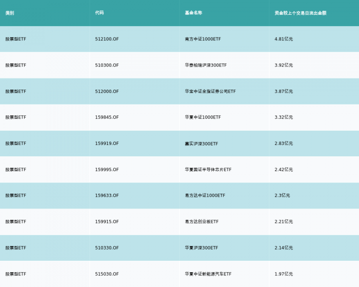昨日股票型ETF资金流出最多的3支ETF及其流入金额分别为:南方中证1000ETF(流出4.81亿元)、华泰柏瑞沪深300ETF(流出3.92亿元)、华宝中证全指证券公司ETF(流出3.87亿元)。资金流出前10详情见下表: