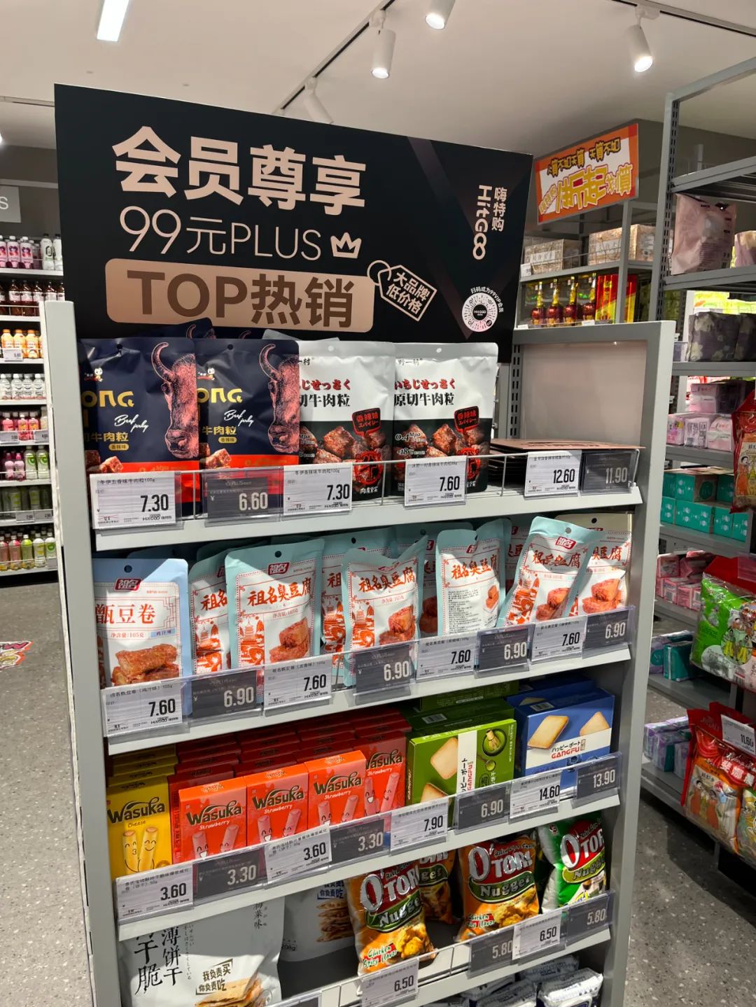 折扣店们正急于实现品牌价值的最大化。2021年底,嗨特购推出了99plus会员年卡体系,99元购买会员卡后,消费者能够享受部分商品会员价及两张优惠券奖励。王欣告诉《豹变》,“嗨特购推会员卡的力度非常大”,她办会员卡的原因是一款面膜的会员价与非会员价相差20元。在收银台结算环节,店员几乎会向每一位顾客推销会员卡。