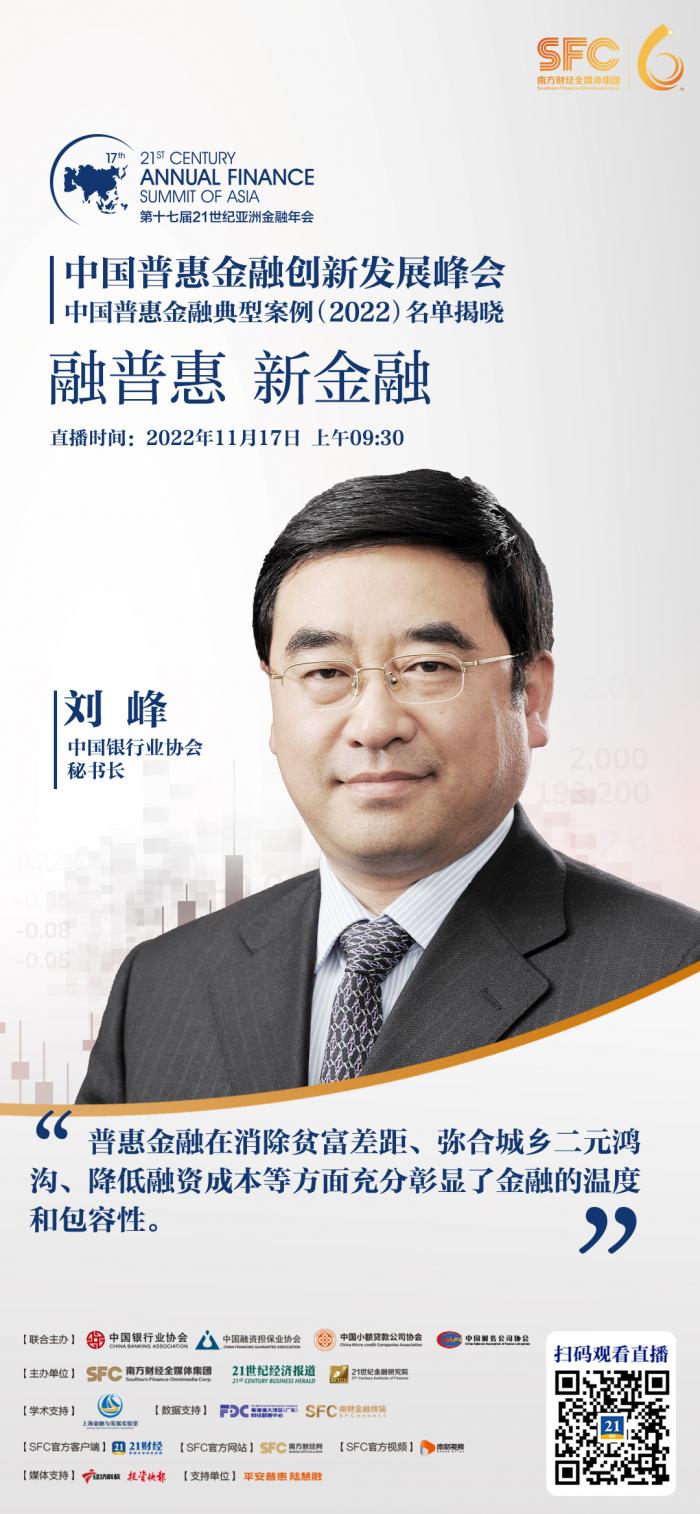 11月17日,中国银行业协会秘书长刘峰在“融普惠 新金融”中国普惠金融创新发展峰会(2022)上做了“以高质量发展为主线 奋进普惠金融服务中国式现代化新征程”为主题的演讲。该峰会由中国银行业协会、中国融资担保业协会、中国小额贷款公司协会、中国财务公司协会、南财集团21世纪经济报道21金融研究院联合主办,上海金融与发展实验室提供学术支持。