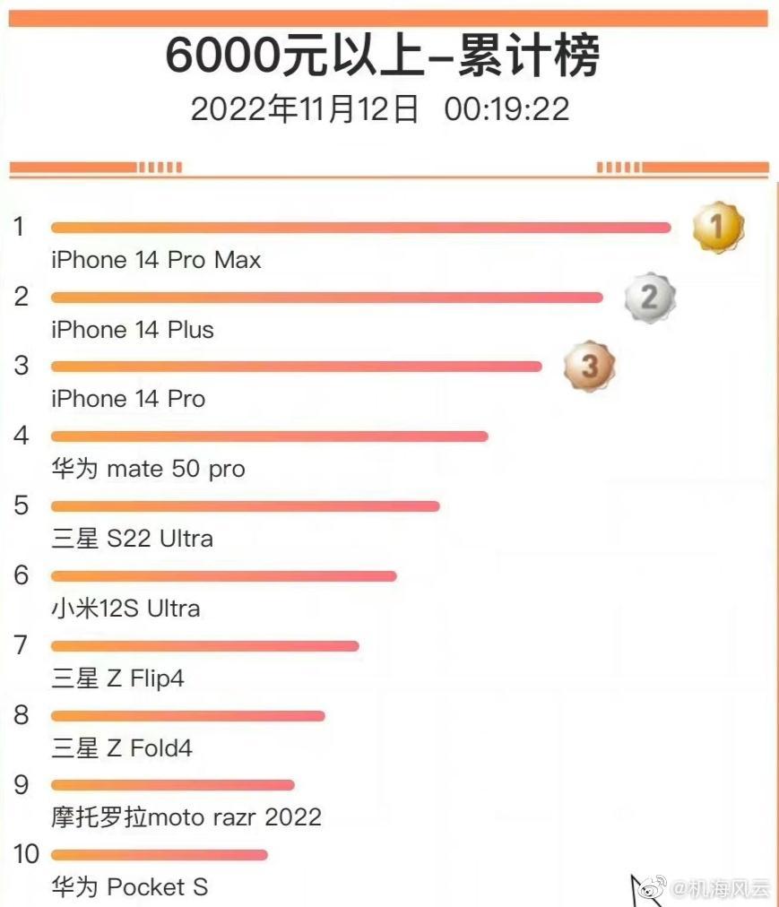 有网友称,那排在第四名的华为 Mate 50 Pro与iPhone 14 Pro差距也不大啊,别急,这个图标的比例长度仅仅示意,我们再看一下,全价段的销量总榜的TOP 10,你们就能发现问题所在了。