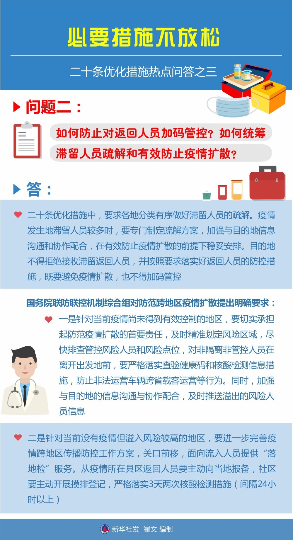 答:二十条优化措施中,要求各地分类有序做好滞留人员的疏解。疫情发生地滞留人员较多时,要专门制定疏解方案,加强与目的地信息沟通和协作配合,在有效防止疫情扩散的前提下稳妥安排。目的地不得拒绝接收滞留返回人员,并按照要求落实好返回人员的防控措施,既要避免疫情扩散,也不得加码管控。