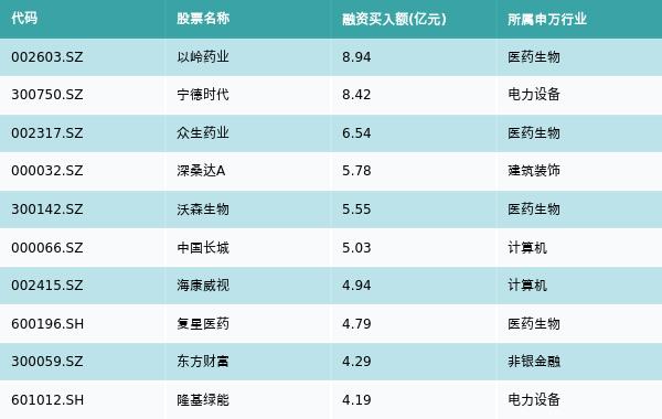 11月18日,两市共有3079只个股有融资资金买入,其中以岭药业、宁德时代、众生药业排名前三,买入金额分别8.94亿元、8.42亿元、6.54亿元。融资买入额前10个股详情见下表: