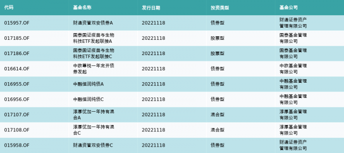 11月18日,有9只新基金发行,分别为:财通资管双安债券A、国泰国证疫苗与生物科技ETF发起联接A、国泰国证疫苗与生物科技ETF发起联接C、中欧尊悦一年定开债券发起、中融恒润纯债A、中融恒润纯债C、淳厚优加一年持有混合A、淳厚优加一年持有混合C、财通资管双安债券C,详情见下表: