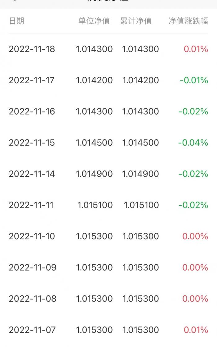 比如“招银理财丰和短债14天持有期1号”,11月14、15、16日净值涨跌幅分别为-0.10%、-0.04%、-0.06%,而17日为0.00%,18日还涨了0.01%。“信银理财乐赢稳健中短债”18日净值也增长了0.01%。
