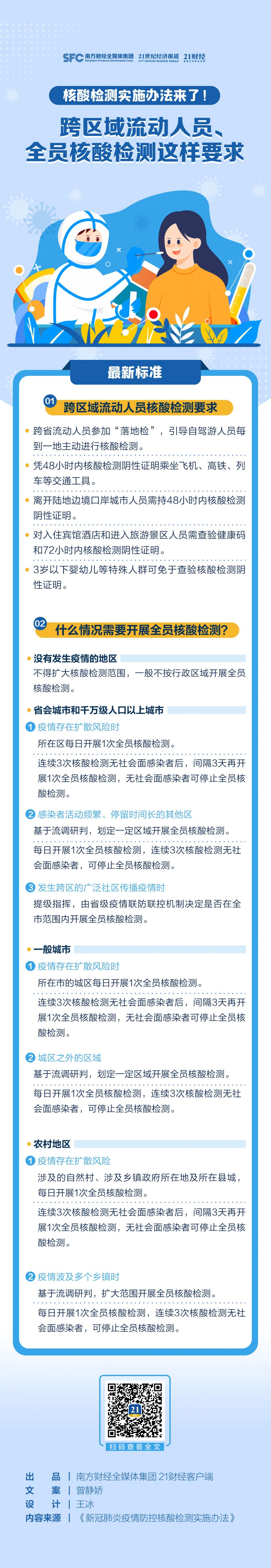国务院联防联控机制综合组制定的《新冠肺炎疫情防控核酸检测实施办法》明确了跨区域流动人员核酸检测要求及全员核酸检测标准。