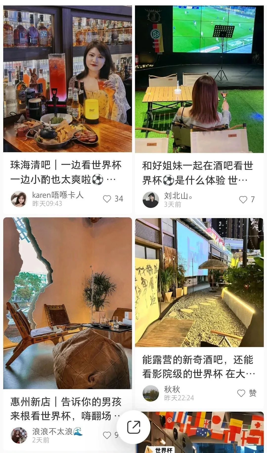 小红书上,关于“世界杯”就有33万多篇笔记,“世界杯酒吧营销”“世界杯酒吧活动”等话题的讨论度也很热烈。而在短视频平台上,一些网红达人也活跃在各种酒馆里,围绕“世界杯期间在哪看球”做探店视频,不少酒馆老板、店员每天通过门店账号做世界杯主题直播。