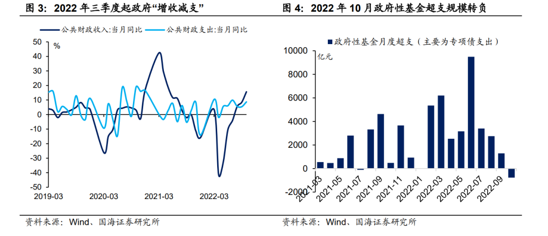 (1) 上半年“留抵退税”透支财政潜力,下半年财政支出或小于季节性,对资金面不利。从真实数据上看,为应对财政收入压力,三季度末开始政府确实在“增收减支”,公共财政收入增速明显高于支出增速。