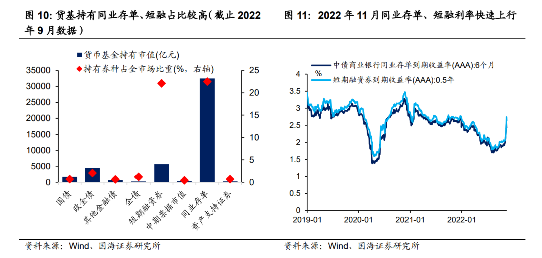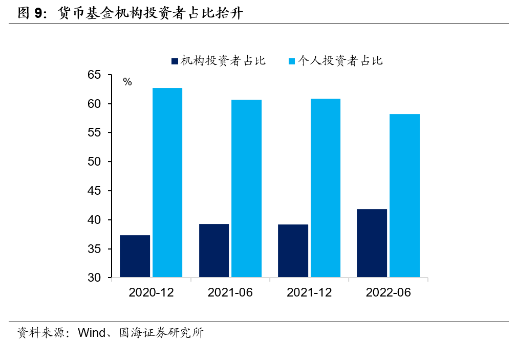 2021年下半年以来,在LPR市场化改革过程中,银行存款收益率大幅下降。银行自营投向公募货币、短债产品相比于投向同业存款或直接配债,收益相对可观、流动性较好,因此前者逐渐受到银行自营资金的青睐。例如从数据上来看,近1年来货币基金中机构投资者占比明显抬升。