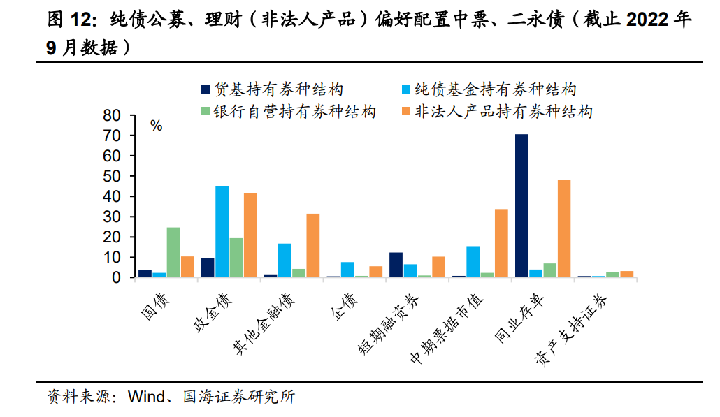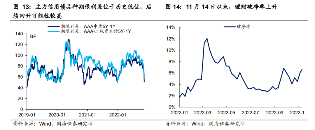 相比于银行自营,纯债公募、固收类理财持有商业银行二永债及中票占比更高、但流动性略差。上述券种的中长久期品种,可能在“第二阶段”机构调仓的过程中面临阶段性抛压,并且带动期限利差的回升。同时,银行理财也可能逐步减少中长期委外产品的头寸。