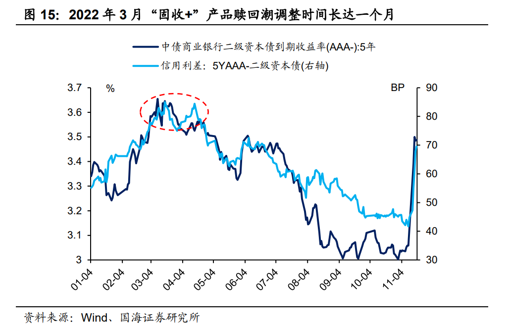 复盘2022年3月由权益市场下跌带来的“固收+”产品赎回潮,可以发现:理财产品破净率在3月中旬达到顶峰后,受散户赎回的阶段性影响,商业银行二永债信用利差持续高位盘整,直到4月中旬才见顶回落,调整时间长达一个月。