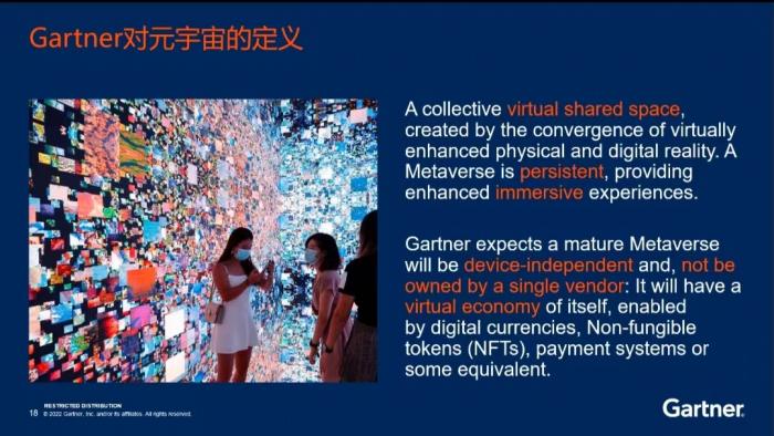 根据Gartner定义,“元宇宙”是一个“虚拟共享空间”,其中包括五个属性:Persistent(持久性)、Immersive(沉浸式)、Device-independent(独立的设备)、Not beowned by a singlvendor(不会被某一家厂商所垄断)、Virtual economy(虚拟经济体)。