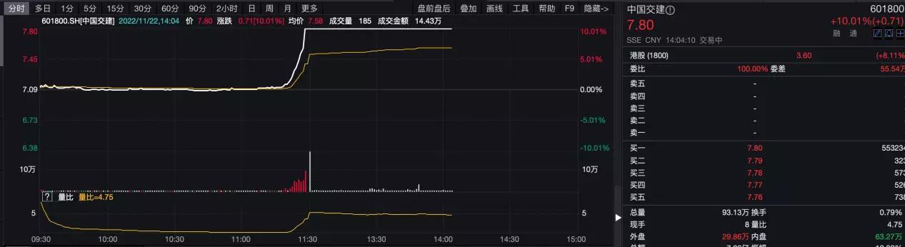 11月22日,大基建央企板块临近早盘收盘时突然爆发,截至发稿,中国交建涨停、中国中冶、中国铁建、中国化学、中国建筑、中国电建、中国中铁、中国核建、中国能建等大幅上涨。