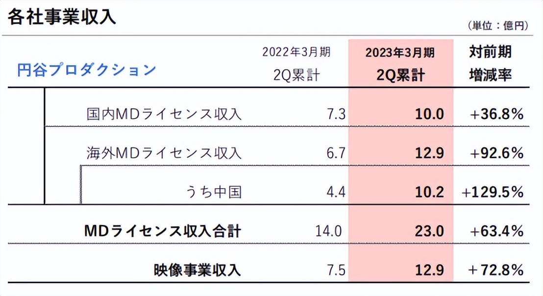 具体来看收入数据,今年二、三季度,圆谷的日本国内商品销售和许可证收入达10亿日元,同比增加36.8%,主要受热门电影《新·奥特曼》上映带动商品销售;