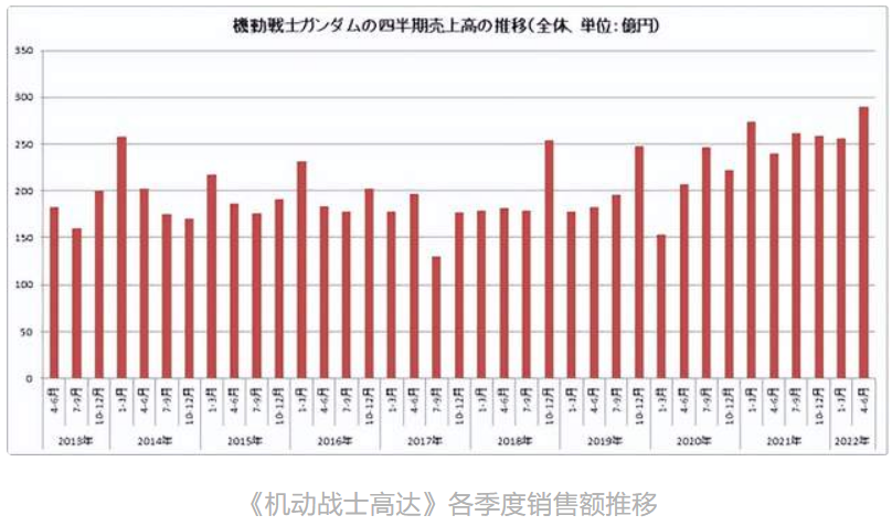 从上图可以看出,今年二季度,《机动战士高达》单季度销售额290亿日元,创下历史新高,根据三季度最新数据,销售额334亿日元,再次刷新历史记录,,保持持续高增长态势。