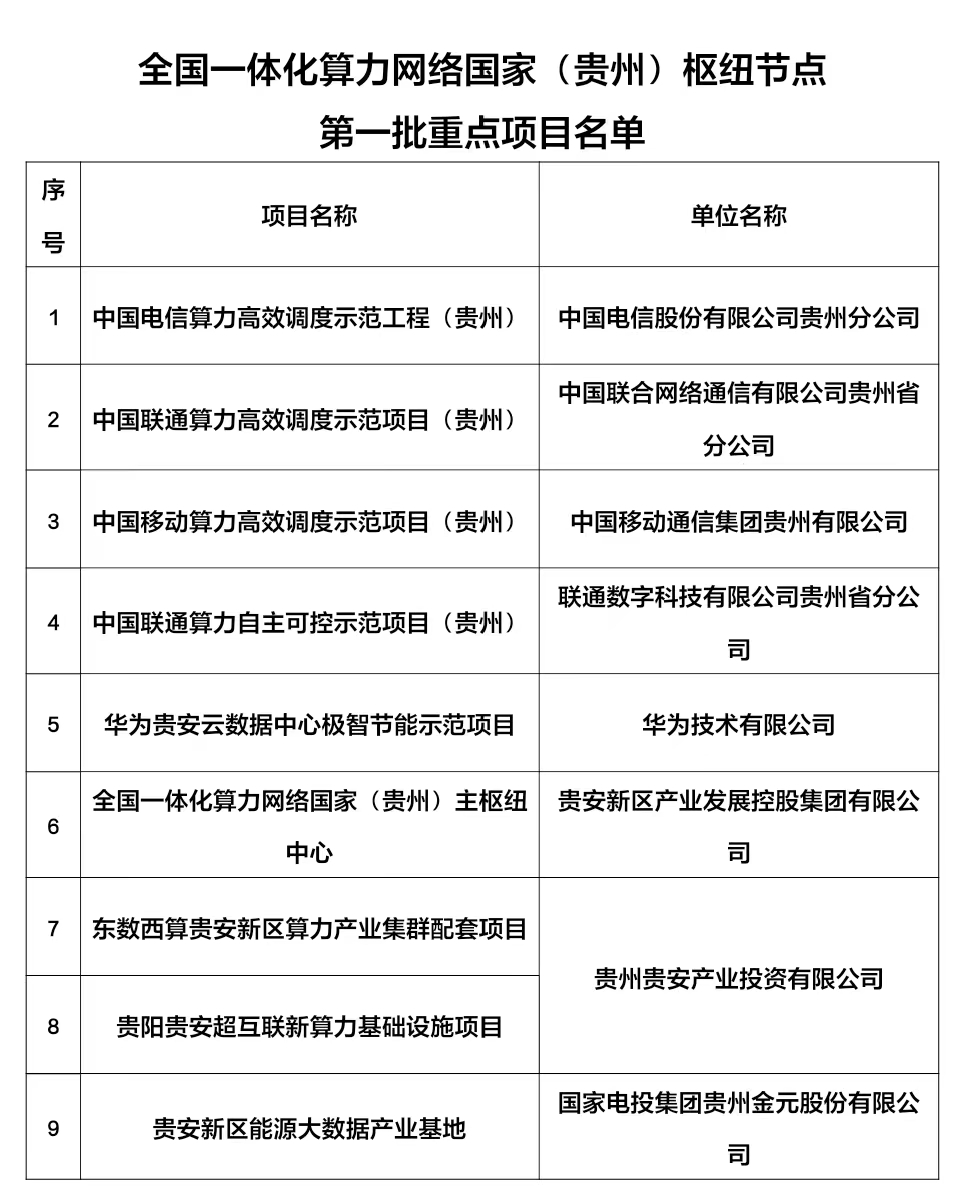 近日,记者从贵州省大数据发展管理局获悉,为持续推进贵州省“东数西算”工程建设,省大数据局公布了全国一体化算力网络国家(贵州)枢纽节点第一批重点项目名单。