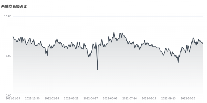 今日该指标值为6.57%,目前该指标处于近一年中立区间,说明投资者对A股持中立情绪。反映场内投资者借钱炒股的杠杆水平,该指标越高说明杠杆水平越高,即投资者认为当前市场较强,反之则说明投资者认为市场相对较弱,因而与上证指数存在较强的正相关性。