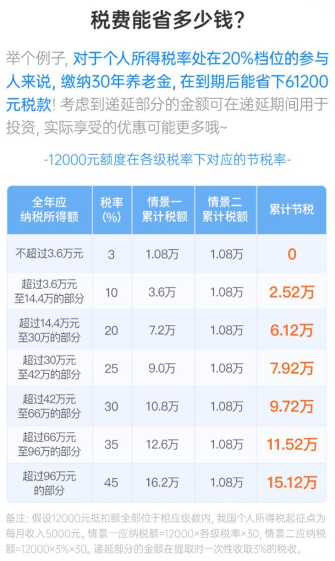 比如说,参与人的所得税率处在20%档位,那么其缴纳30年12000元额度的个人养老金,到期后能省下61200元税款。