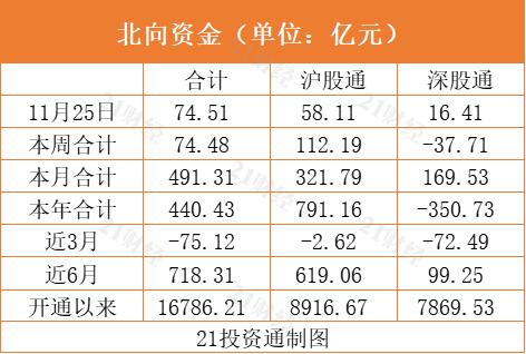 据21投资通智能监测,北向资金连续三日录得净流入,全天净买入74.51亿元,其中沪股通净买入58.11亿元,深股通净买入16.41亿元。