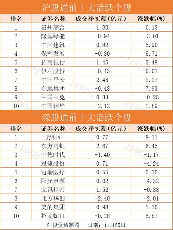 十大活跃个股方面,东方雨虹(002271.SZ)、中国平安(601318.SH)、贵州茅台(600519.SH)净买入额居前,金额分别为2.67亿元、2.48亿元、1.80亿元。