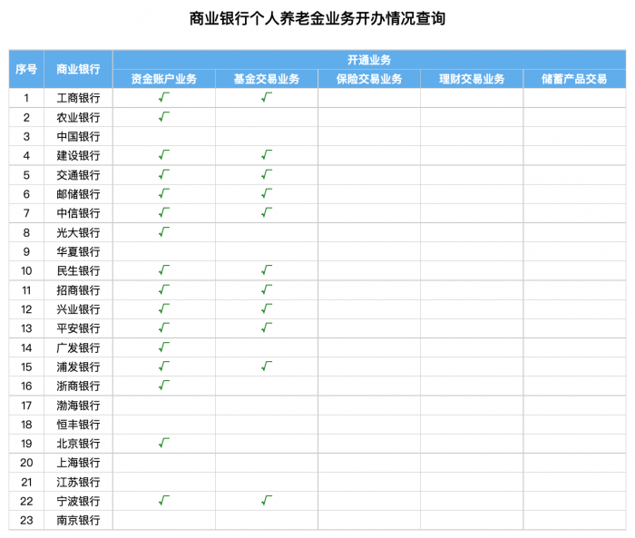 在商业银行个人养老金业务开办显示,目前23家银行有办理商业银行个人养老金业务的资格,但实际上仍有多家银行不可办理个人养老金业务,如中国银行、华夏银行、渤海银行、恒丰银行、上海银行、江苏银行、南京银行。