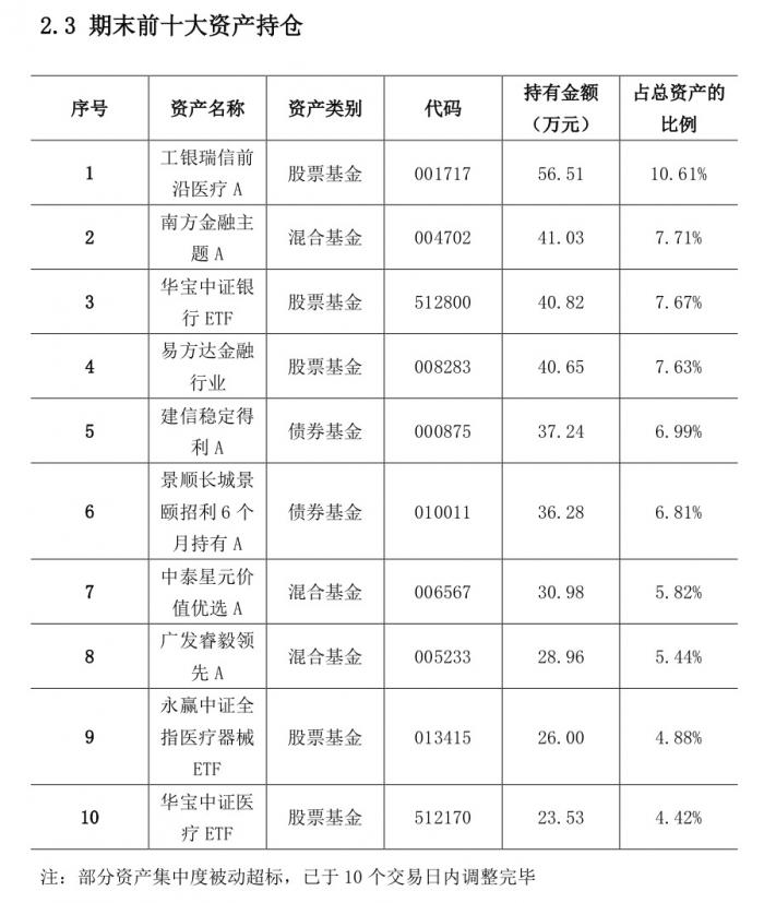 根据2022年三季度报告,该产品通过资管产品投资公募基金,三季度末公募基金占总资产比例为91.38%,前十大持仓资产均为公募基金,以股票基金和混合基金为主,持仓行业上偏向金融和医药。