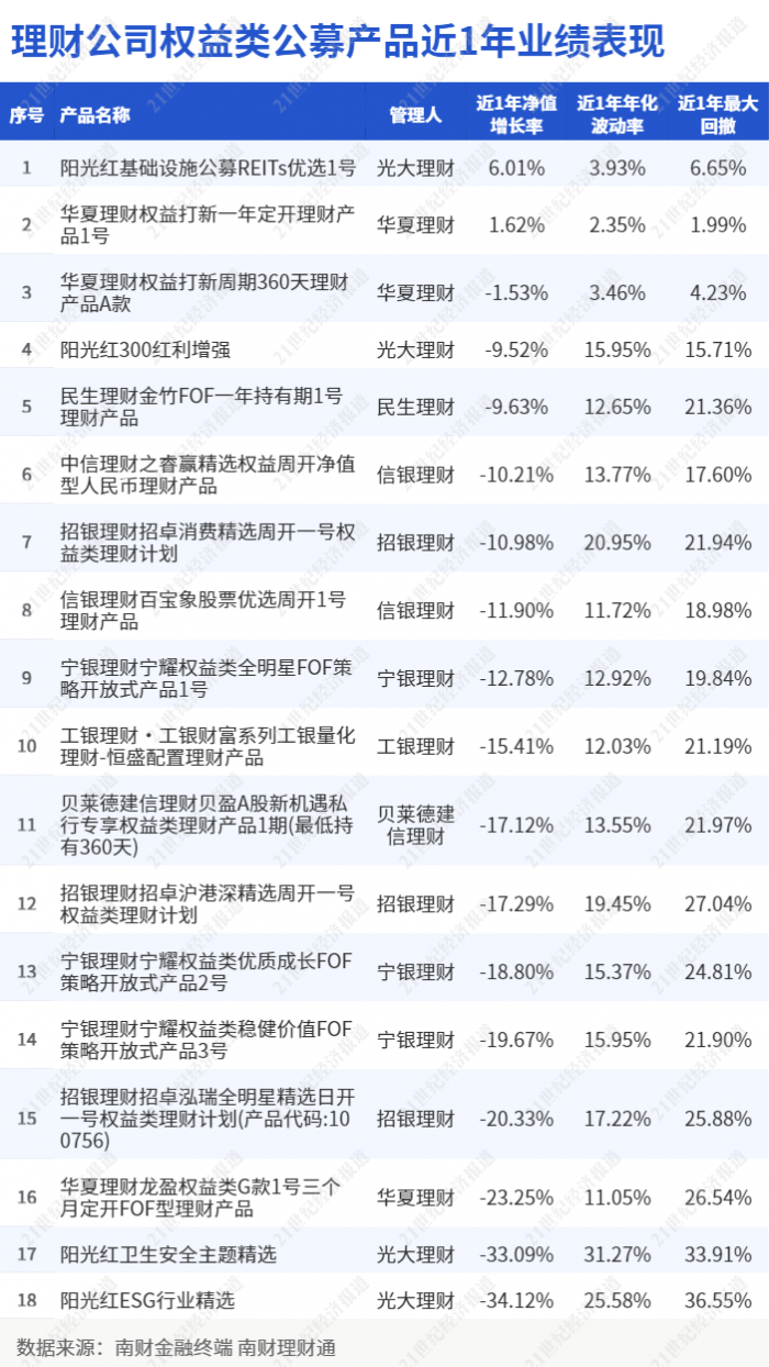 从权益类公募产品近1年业绩表现看,光大理财“阳光红基础设施公募REIT优选1号”稳居第一,近1年净值上涨6.01%,华夏理财的打新策略产品“权益打新一年定开1号”次之,近1年净值增长率为1.62%,从...