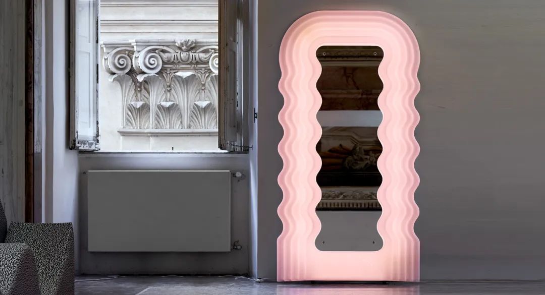 知名建筑师Ettore Sottsass在上世纪70年代为意大利Poltronova公司设计了一款名为Ultrafragola(意大利语意为“终极草莓”)的全身穿衣镜。设计师从大波浪卷发获得灵感,为这款镜子设计了一圈弯曲的轮廓,看上去十分柔软,并且还能发出肉粉色的灯光,以今天的审美来评价可以称得上是拉满了氛围感。