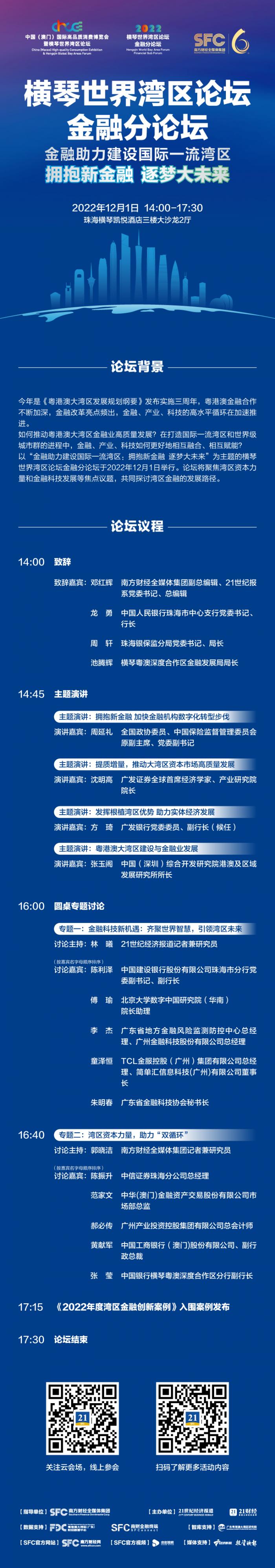 值得一提的是,金融分论坛还将发布由南方财经全媒体集团、21世纪经济报道发起征集的《2022年度湾区金融创新案例》入选优秀案例,聚焦粤港澳大湾区金融创新发展成果,学习金融领域的创新案例,表彰全国范围内致力于金融创新发展的优秀机构和企业,对大湾区金融创新及金融服务实体经济提出更积极有效的示范,为大湾区乃至全国金融的高质量发展提供切实有效的思考和建议。