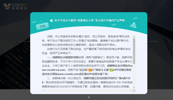对此,维信金科及成都维仕小贷第一时间发布反诈公告,声明公司严格按照国家相关法律法规和规定开展贷款业务,以任何理由或形式收取贷款合同规定以外费用的,均非公司或公司员工行为,提醒广大群众提高警惕,谨防受骗。