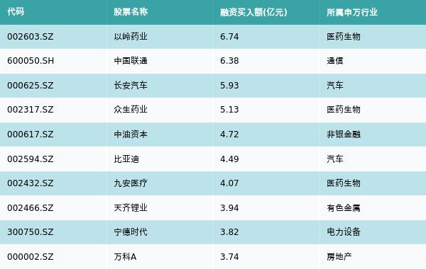 11月30日,两市共有3085只个股有融资资金买入,其中以岭药业、中国联通、长安汽车排名前三,买入金额分别6.74亿元、6.38亿元、5.93亿元。融资买入额前10个股详情见下表: