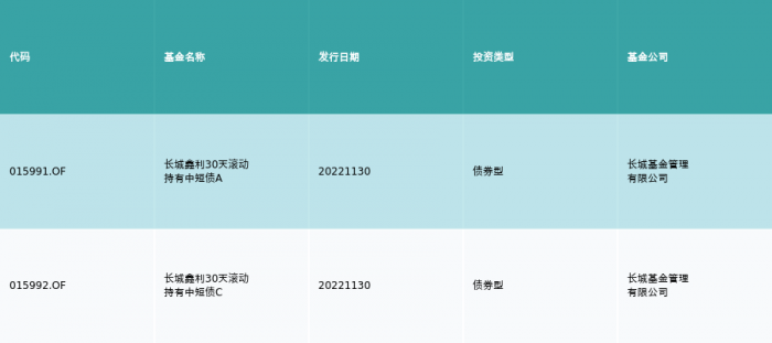 11月30日,有2只新基金发行,分别为:长城鑫利30天滚动持有中短债A、长城鑫利30天滚动持有中短债C,详情见下表: