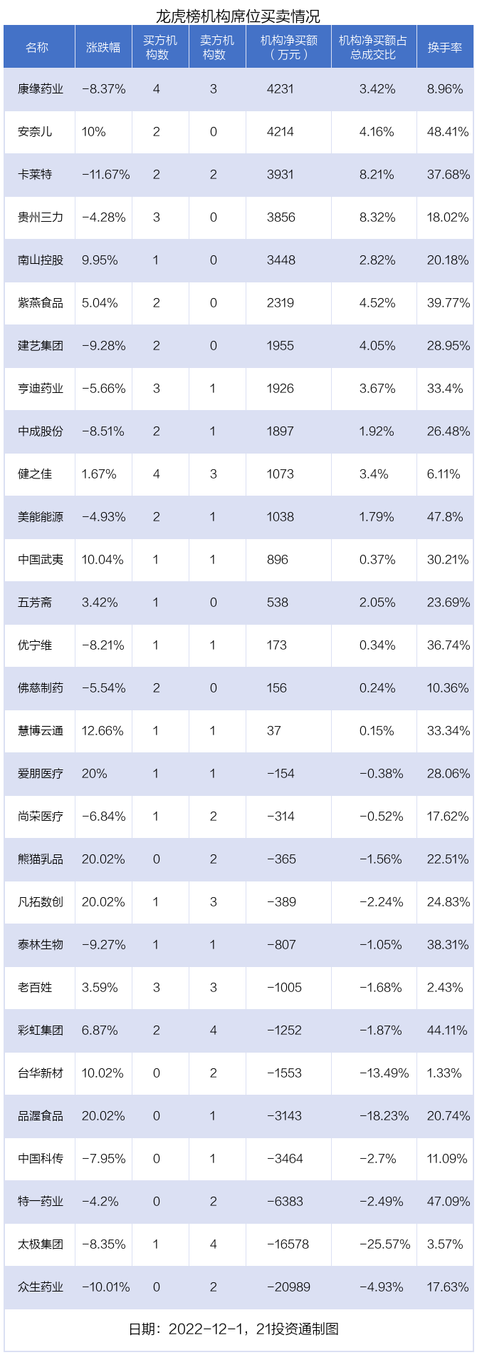 12月1日,29只个股龙虎榜出现了机构的身影,机构合计净卖出2.47亿元。具体来看,机构净买入16股,净卖出13股。