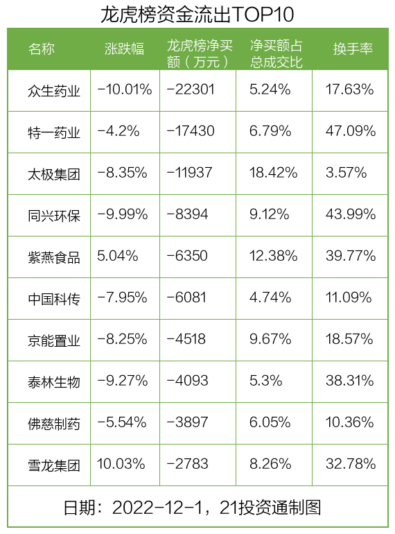 而龙虎榜中资金净流出最多的是众生药业(002317.SZ),被净卖出为2.23亿元,占总成交金额的5.24%。众生药业收盘下跌10.01%,换手率为17.63%。