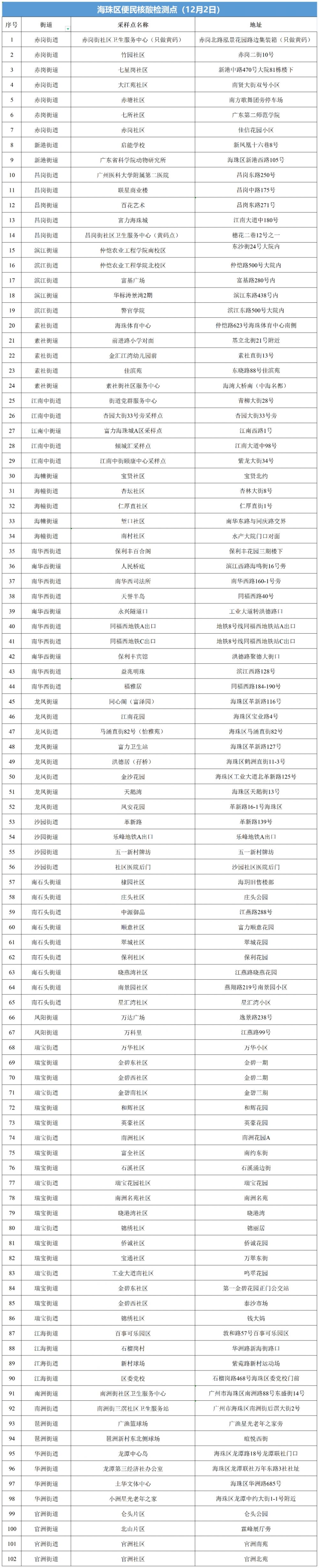 海珠区黄码采样点汇总表