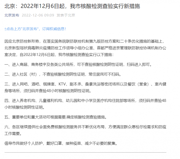 北京:12月6日起进入商超、商务楼宇等公共场所可不查验核酸检测阴性证明