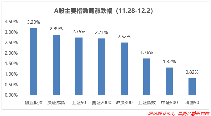 上周A股表现超预期上行,全部指数收涨,周内受到全国疫情防控政策转向,主力、外资均纷纷进场,弹性更大的创业板、深证成指领涨,分别上涨3.2%、2.89%;核心资产方面中字头股票周内同样活跃,带动上证50、沪深300均涨超2.5%,上证指数冲高回落,周内收涨1.76%;微盘股表现同样不俗,国证2000涨幅接近2.7%,中证500涨超1.3%;前期涨幅较多的科创50周内涨幅不大,不到1%。